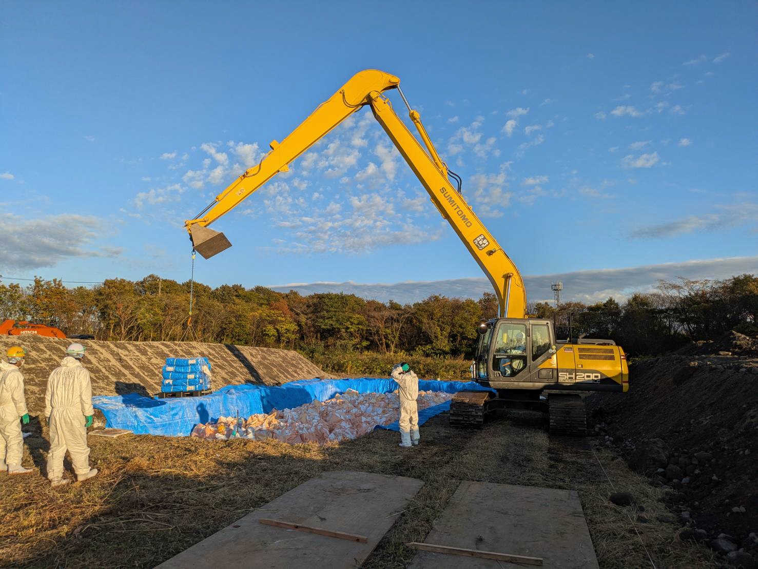 胎内市の養鶏場において発生した高病原性鳥インフルエンザに際して、新潟県との「災害時の応援業務に関する協定」に基づき、直ちに当協会新発田支部の会員会社が処分のための埋却溝の掘削、埋戻し等の防疫作業を実施しています。